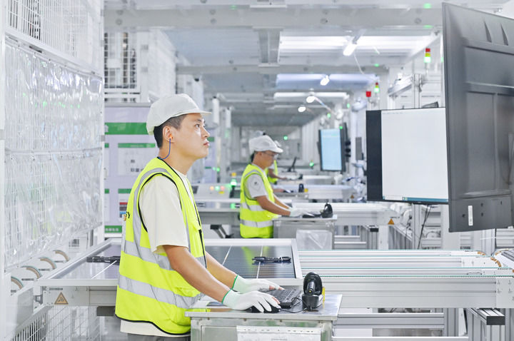 工人在位于浙江省樂清市的正泰集團8GW高效光伏組件生產(chǎn)基地工作(資料照片)。新華社發(fā)