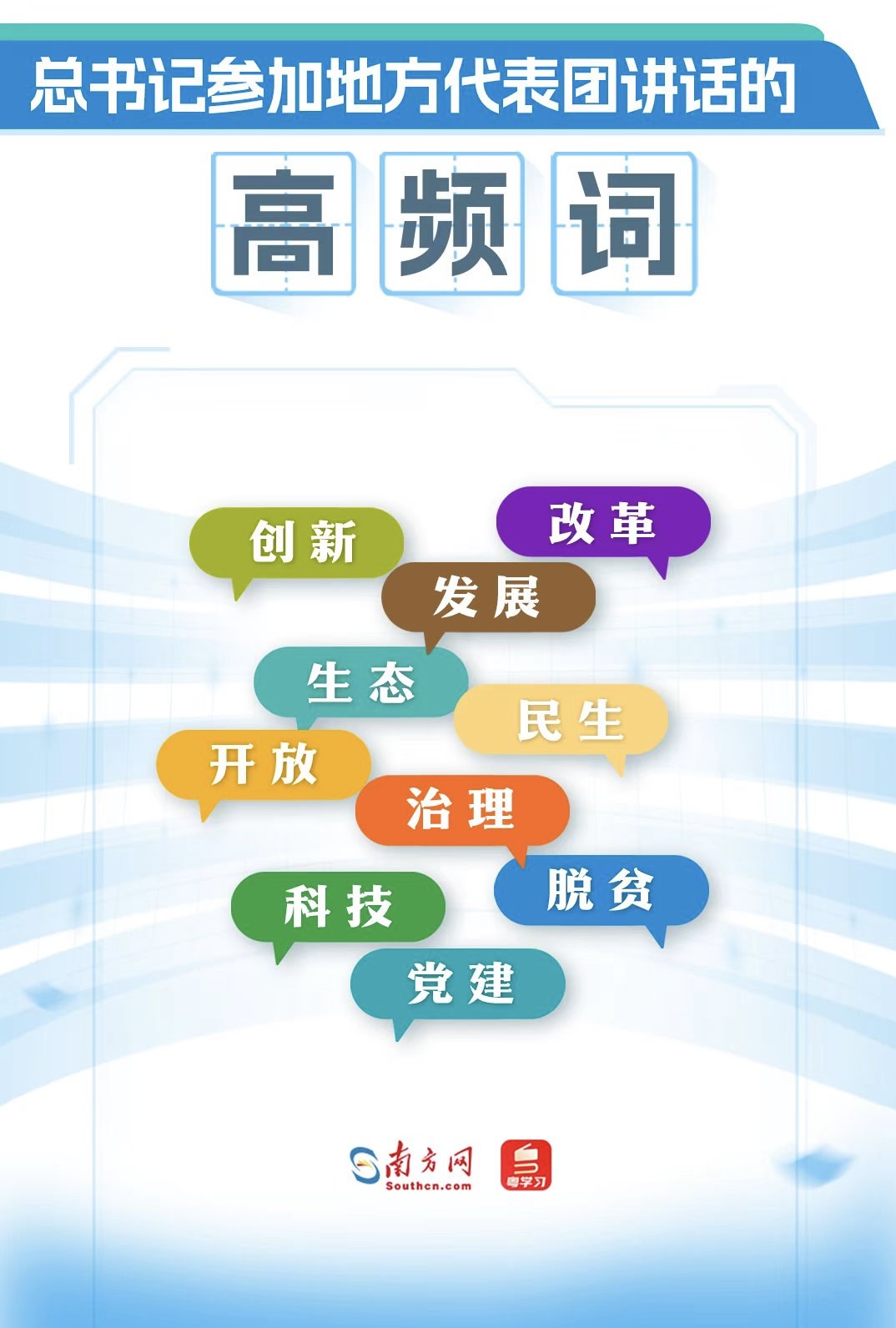 13年36次參加地方代表團(tuán)審議,習(xí)近平總書記的講話里,有哪些高頻詞?從詞云圖中,“創(chuàng)新”“改革”“發(fā)展”“生態(tài)”“民生”“開放”“治理”“脫貧”“科技”“黨建”等詞語(yǔ)引人注目,反映了總書記的關(guān)注點(diǎn)。