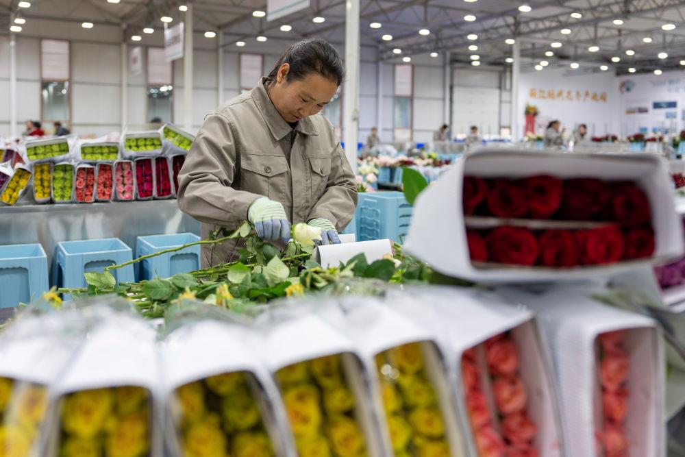 △近日,工作人員在云南麗江現(xiàn)代花卉產(chǎn)業(yè)園包裝鮮花。