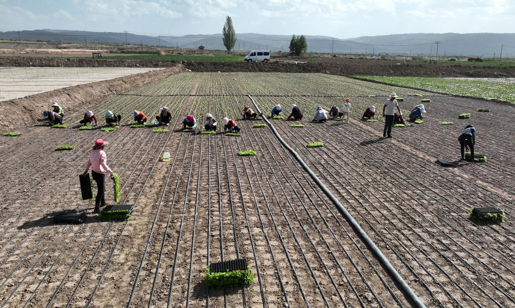 甘肅省定西市安定區(qū)內(nèi)官營鎮(zhèn)菜農(nóng)在鋪設(shè)了滴灌管道的地里移植西芹(資料圖片)。(楊曉軍 攝)