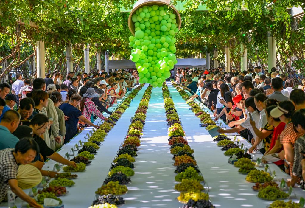 人們在吐魯番特色葡萄集市上品嘗葡萄(2024年8月17日攝)。新華社記者 陳朔 攝