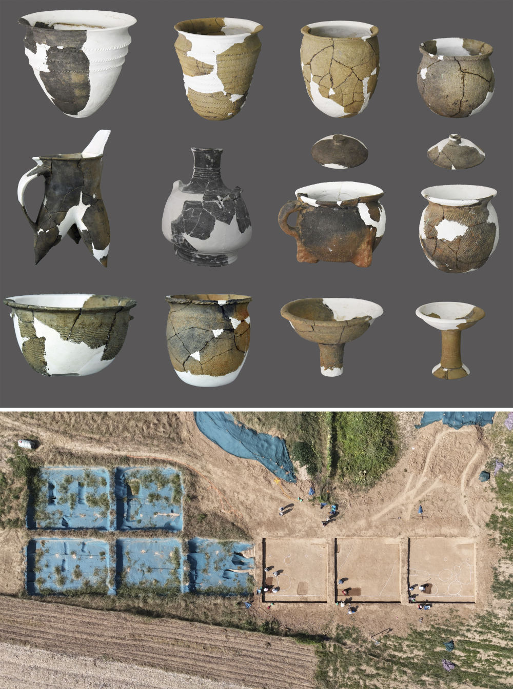 拼版照片:上圖為位于河南南陽方城縣的八里橋遺址出土的陶器(河南省文物考古研究院供圖);下圖為八里橋遺址發(fā)掘現場(無人機照片,新華社記者袁月明2024年9月11日攝)。八里橋遺址是豫南地區(qū)已發(fā)現規(guī)模最大、等級最高的二里頭文化聚落,為探索夏文化地方城邑聚落形態(tài)、社會結構提供了新線索。