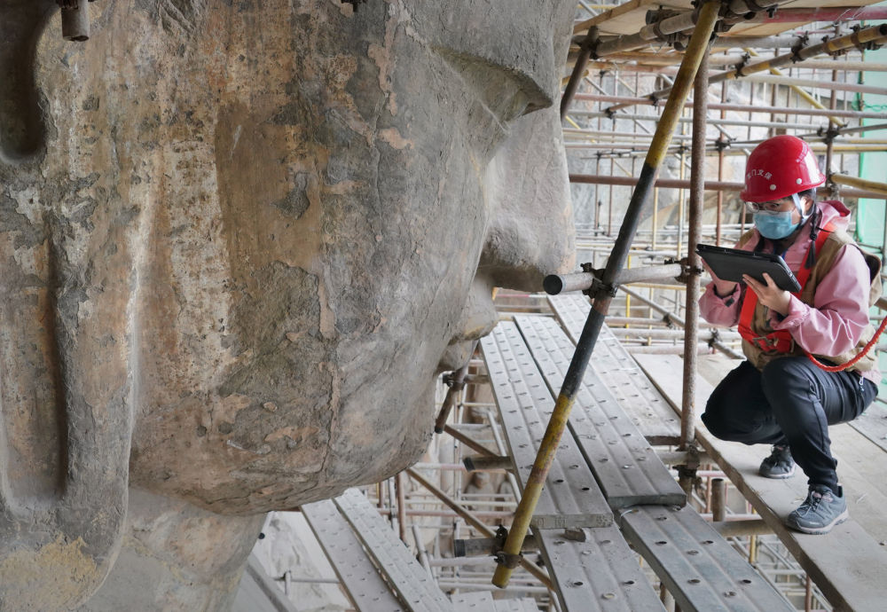 奉先寺位于河南洛陽龍門西山南段,是龍門石窟開鑿規(guī)模最大、最具代表性的摩崖像龕。2022年7月,龍門石窟奉先寺大型滲漏水治理和危巖體加固保護工程完工。這是工作人員在龍門石窟奉先寺進行勘測作業(yè)(2022年4月14日攝)。