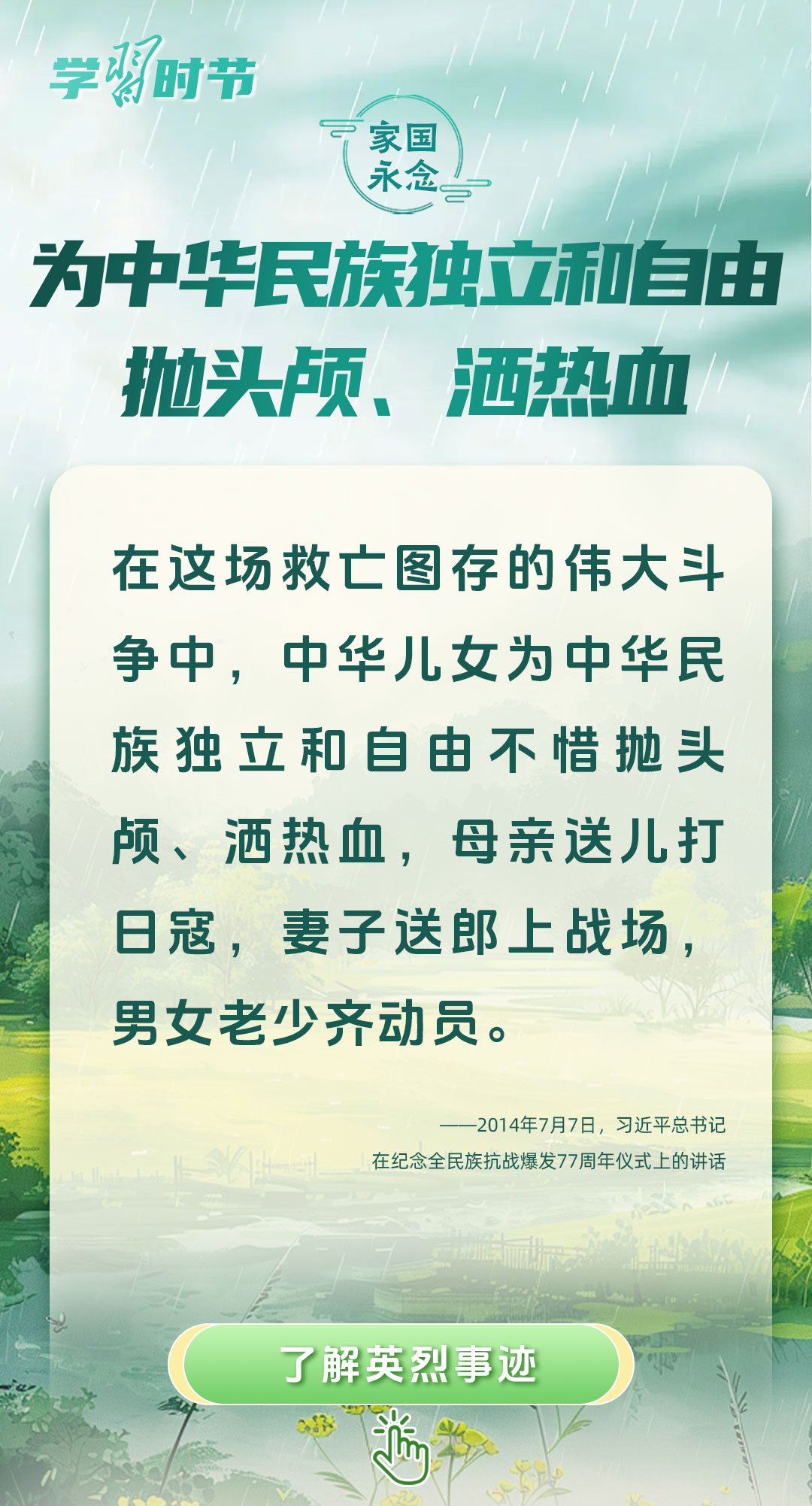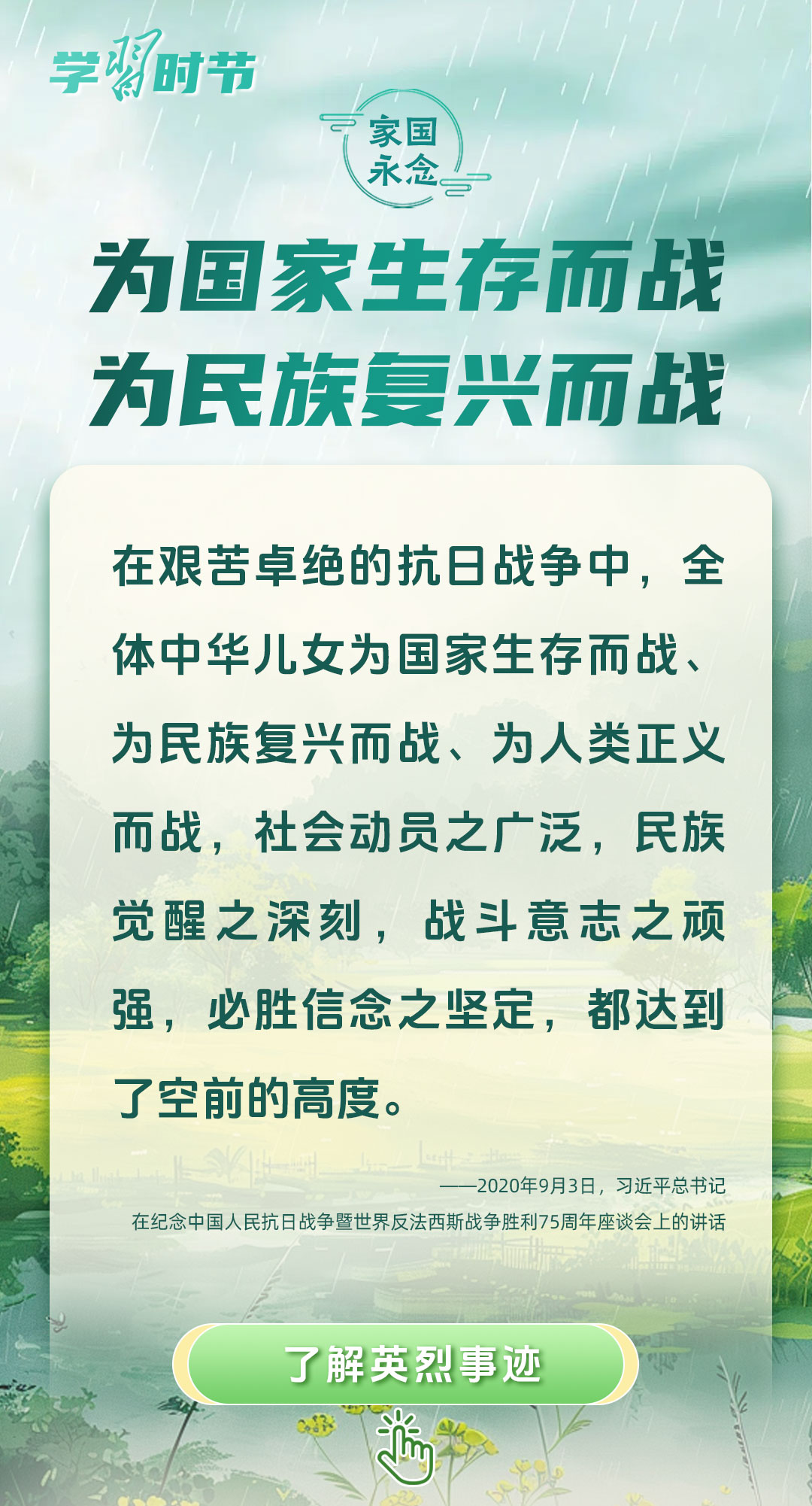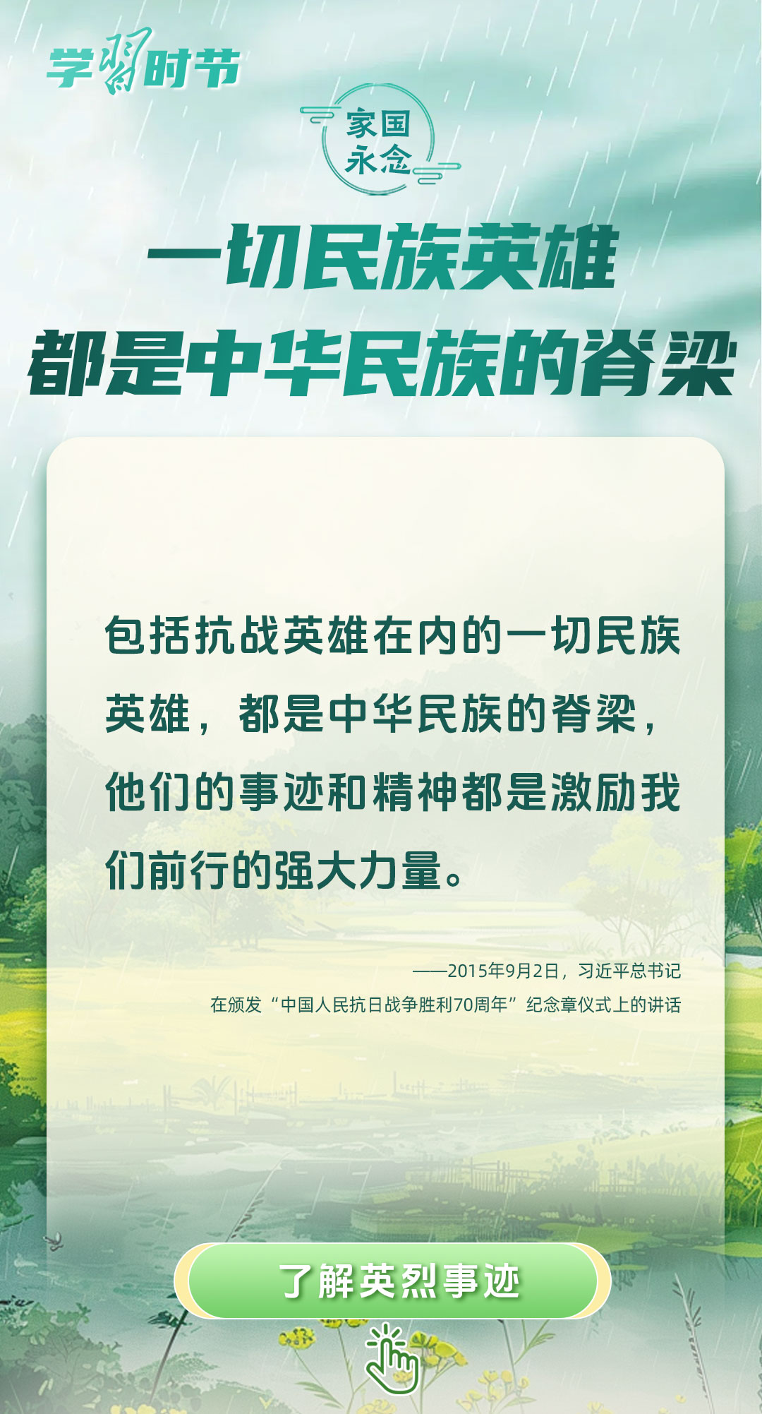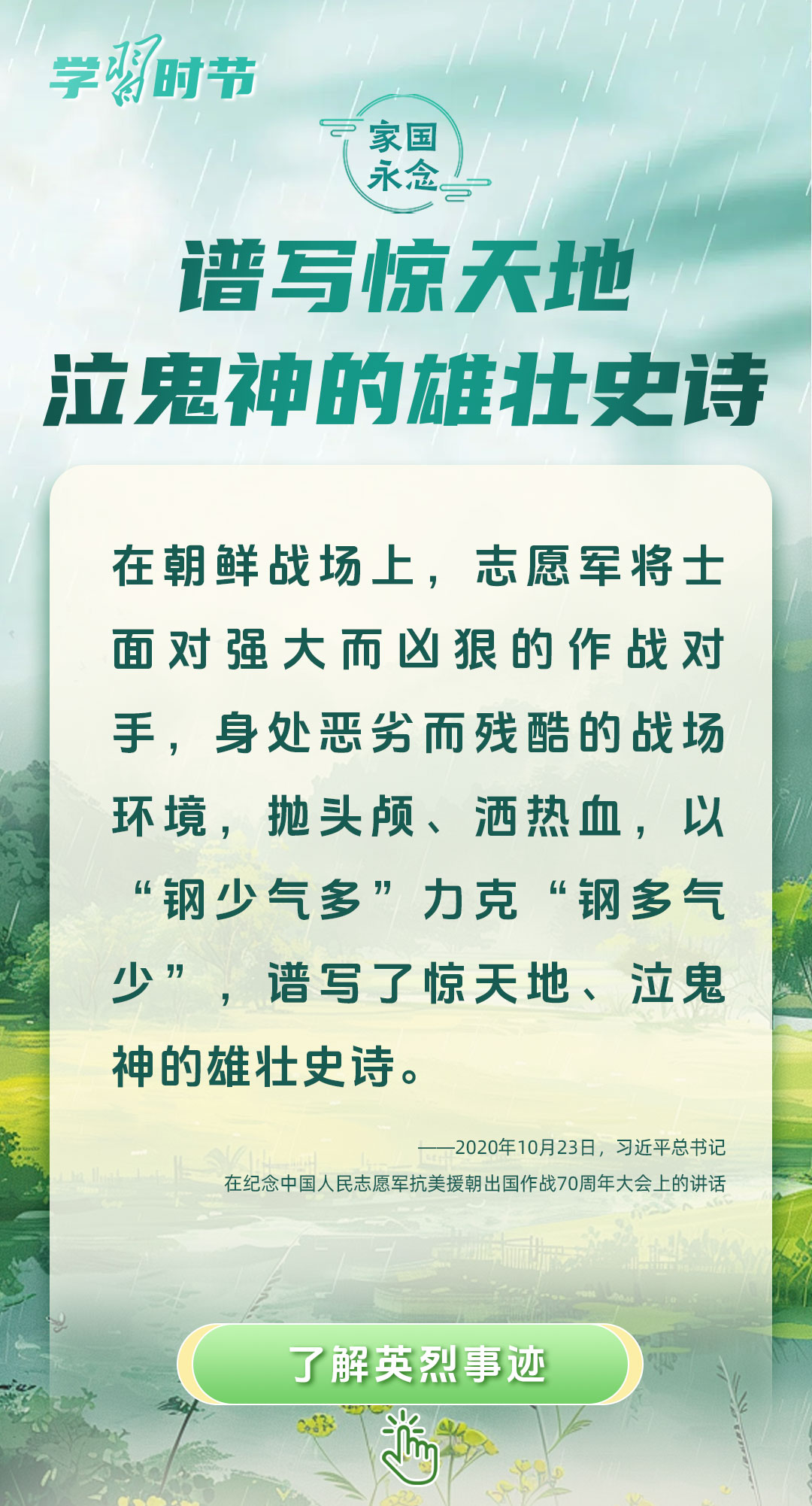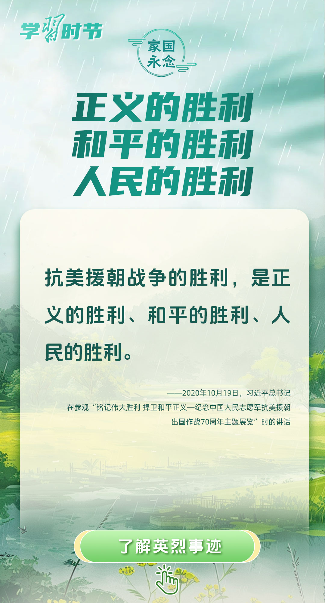 今年是中國人民抗日戰(zhàn)爭暨世界反法西斯戰(zhàn)爭勝利80周年、中國人民志愿軍抗美援朝出國作戰(zhàn)75周年。習(xí)近平總書記曾說:“對一切為國家、為民族、為和平付出寶貴生命的人們,不管時代怎樣變化,我們都要永遠(yuǎn)銘記他們的犧牲和奉獻(xiàn)?!苯裉煳覀兯鶕碛械囊磺校瑹o不凝結(jié)著英雄、英烈們的奉獻(xiàn)付出乃至巨大犧牲。