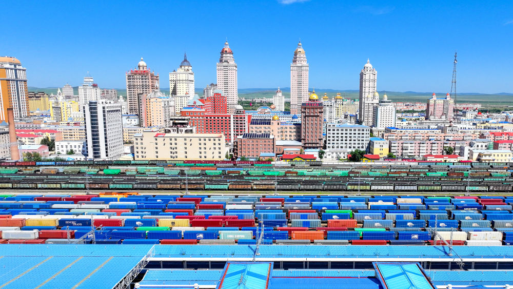 2024年8月20日,中歐班列在內(nèi)蒙古滿洲里口岸準備出境(無人機照片)。滿洲里口岸位于中俄蒙三國交界處,是中國最大的陸路口岸,也是連接俄羅斯、蒙古國的重要樞紐。2024年,滿洲里口岸中歐班列通行量突破4000列,為推進高質(zhì)量共建“一帶一路”注入新動能。