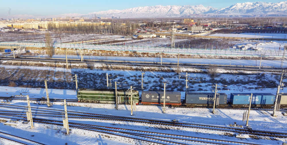 2024年12月25日,一列中歐班列經(jīng)霍爾果斯口岸駛向哈薩克斯坦(無人機照片)?;魻柟箍诎兜靥幰晾绻_克自治州、毗鄰哈薩克斯坦,是古絲綢之路北道上的千年驛站,也是近現(xiàn)代對外開放的百年口岸,更是我國面向中亞、西亞乃至歐洲的重要物流通道。2024年,該口岸中歐(中亞)班列開行量達8730列,同比增長12.5%;貨物過貨量達1208.4萬噸,同比增長10.9%;通行班列線路總數(shù)超過80條,輻射境外18個國家的46個城市。