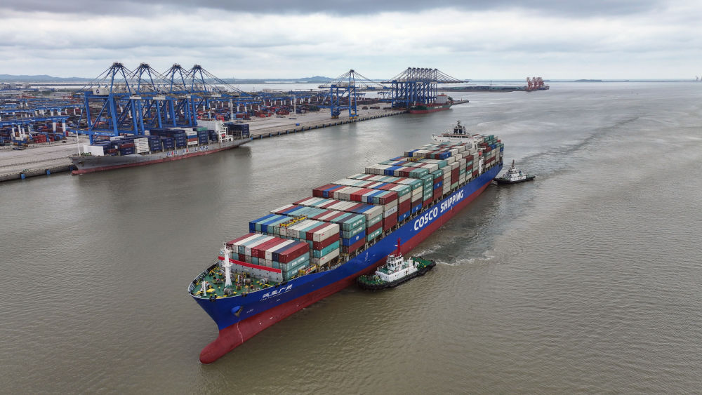 2024年5月19日,一艘海輪在廣西欽州港碼頭靠泊(無人機照片)。欽州港是北部灣港的組成部分,也是中國西南地區(qū)通往東盟的重要出??凇N鞑筷懞P峦ǖ览描F路、公路、水運等多種運輸方式,由重慶一路向南,經(jīng)廣西北部灣出海通達世界各地。截至2025年1月1日,北部灣港總航線達80條,其中外貿(mào)航線49條,基本實現(xiàn)國內(nèi)主要港口和東南亞、東北亞主要港口全覆蓋。