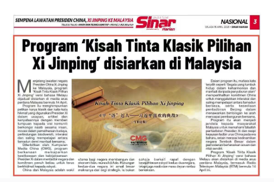 4月15日,馬來(lái)西亞中文、英文、馬來(lái)文主流媒體《星洲日?qǐng)?bào)》《星報(bào)》《陽(yáng)光日?qǐng)?bào)》分別刊發(fā)節(jié)目在馬來(lái)西亞落播的消息。文章指出,《平“語(yǔ)”近人——習(xí)近平喜歡的典故》(馬來(lái)語(yǔ)版)特別選取了“萬(wàn)物各得其和以生,各得其養(yǎng)以成”等典故,生動(dòng)闡釋中國(guó)堅(jiān)持不同文明之間平等交流、互學(xué)互鑒,愿意為人類破解時(shí)代難題、實(shí)現(xiàn)共同發(fā)展提供強(qiáng)大的精神指引,有助于馬來(lái)西亞民眾更好讀懂新時(shí)代中國(guó)之治的成功密碼,感知中國(guó)式現(xiàn)代化蓬勃發(fā)展的強(qiáng)勁脈動(dòng)。