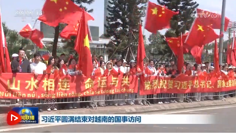 離開河內時,越南總理范明政,越共中央政治局委員、中央書記處常務書記陳錦繡,越共中央書記處書記、中央辦公廳主任黎懷忠等越南黨政領導人和地方代表到機場送行。當?shù)孛癖姾椭匈Y機構、留學生代表高舉紅色橫幅,熱烈祝賀習近平訪問越南取得圓滿成功。