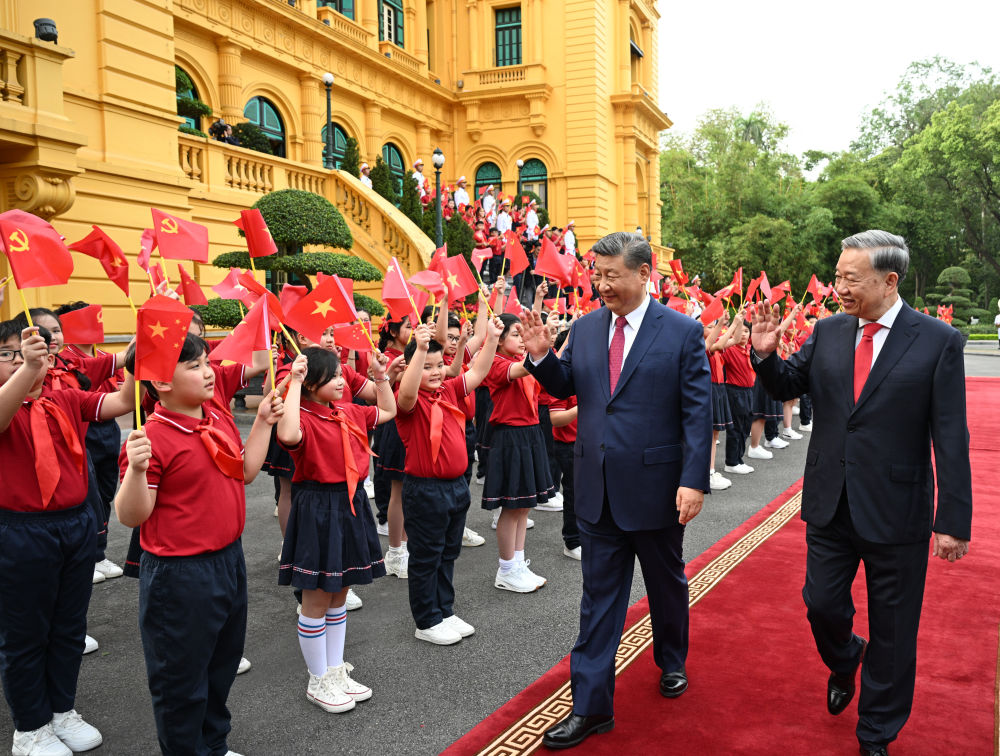 越共中央總書記蘇林為對越南進行國事訪問的中共中央總書記、國家主席習(xí)近平舉行隆重歡迎儀式,兩位領(lǐng)導(dǎo)人在紅毯上并肩前行。