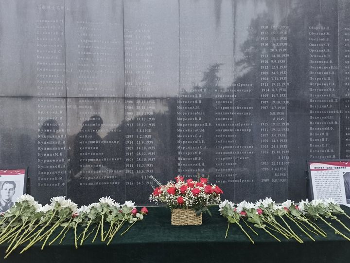 在南京抗日航空烈士紀(jì)念館鐫刻有蘇聯(lián)籍抗日航空英烈名錄的紀(jì)念碑前,擺放著人們獻上的鮮花(2024年11月22日攝)。新華社記者 邱冰清 攝