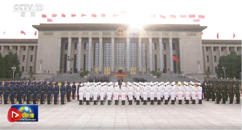 盧拉抵達時,禮兵列隊致敬。習(xí)近平同盧拉登上檢閱臺,軍樂團奏中巴兩國國歌,天安門廣場鳴放禮炮21響。盧拉在習(xí)近平陪同下檢閱中國人民解放軍儀仗隊,并觀看分列式。