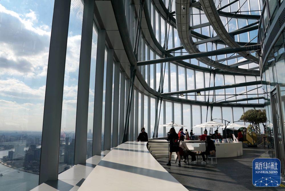 2020年11月12日拍攝的朵云書院觀景臺。有“云端書店”之稱的朵云書院位于上海中心大廈52層。顧客在這里可以“抬頭看云,低頭讀書”,并俯瞰黃浦江兩岸美景。