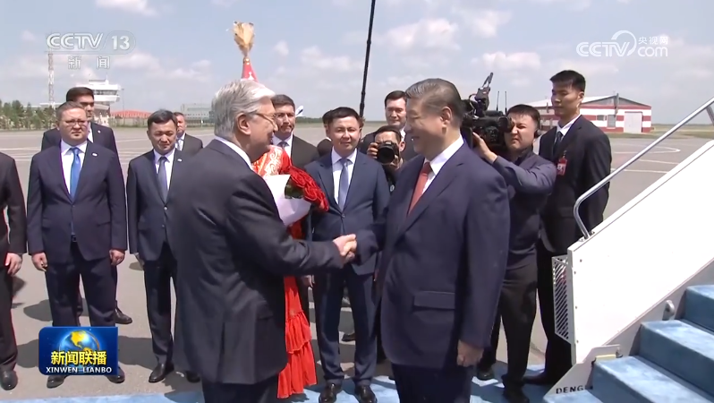 習近平抵達阿斯塔納納扎爾巴耶夫國際機場時,托卡耶夫總統(tǒng)率總統(tǒng)辦公廳主任達杰拜、副總理兼外長努爾特列烏、總統(tǒng)外事顧問卡濟漢、阿斯塔納市長卡瑟姆別克等高級官員熱情迎接。身著盛裝的哈薩克斯坦女青年向習近平獻花。禮兵分列藍地毯兩側致敬,哈薩克斯坦少年兒童手持中哈兩國國旗熱烈歡迎習近平到訪。習近平在托卡耶夫陪同下觀看儀仗隊分列式,直升機懸掛中哈國旗從機場上空飛過。在機場貴賓樓內(nèi),兩國元首還共同欣賞哈薩克斯坦少年兒童的文藝表演。