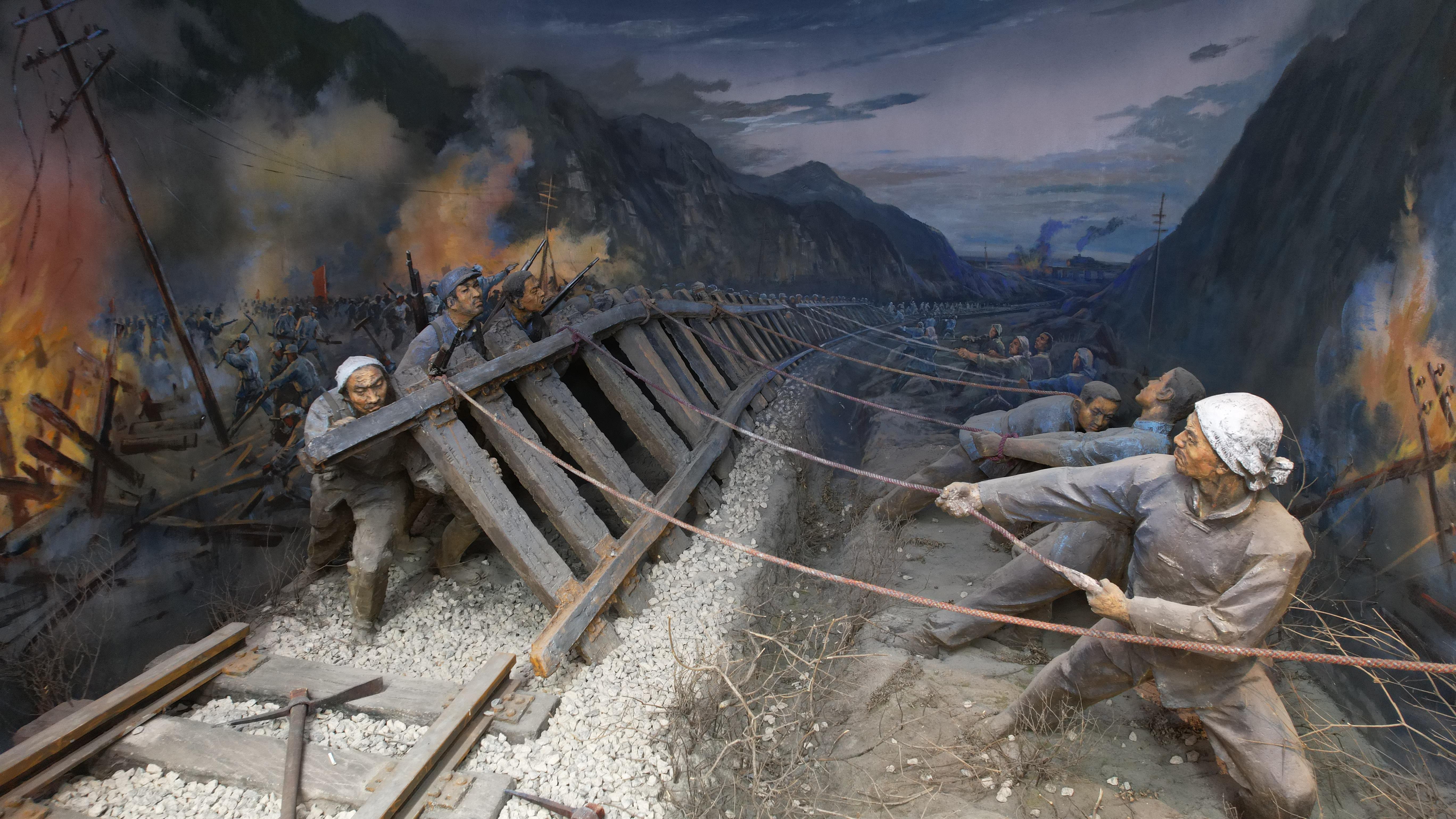 △百團(tuán)大戰(zhàn)紀(jì)念館內(nèi)展示的軍民掀翻鐵軌的場(chǎng)景。(總臺(tái)央視記者范凱、裴大偉拍攝)