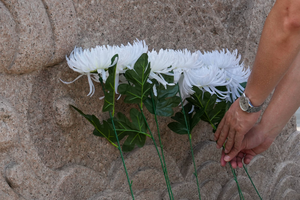 2025年7月7日,觀眾在南京抗日航空烈士紀(jì)念館紀(jì)念碑前獻(xiàn)花,緬懷英烈。新華社記者 李博 攝