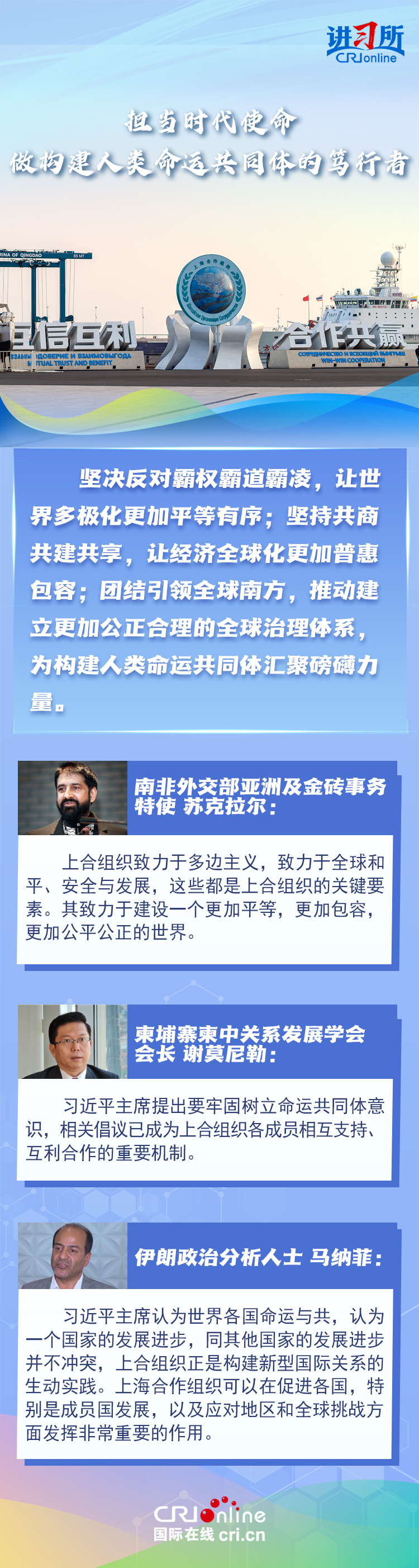“讓‘上海精神’持續(xù)照亮構建上海合作組織命運共同體之路。”上海合作組織成立24年來,始終秉持“上海精神”,成功走出了一條順應時代潮流、契合各方需求的區(qū)域合作道路,樹立起新型國際關系的典范。在國際人士眼中,上海合作組織站在歷史正確一邊,致力于建設一個更加平等,更加包容,更加公平公正的世界,對維護地區(qū)和全球和平至關重要。