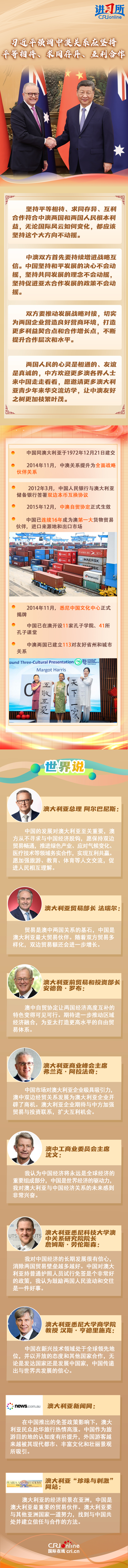近年來,在雙方共同努力下,中澳關(guān)系走出低谷、實(shí)現(xiàn)轉(zhuǎn)圜,給兩國(guó)人民帶來了實(shí)實(shí)在在福祉。中澳全面戰(zhàn)略伙伴關(guān)系已經(jīng)開啟第二個(gè)10年,迎來又一個(gè)重要發(fā)展階段,澳方各界人士及媒體認(rèn)為,中國(guó)的發(fā)展對(duì)澳大利亞至關(guān)重要,澳大利亞要與其他亞洲國(guó)家一道努力,找到與中國(guó)共處并建立信任與合作的方法。