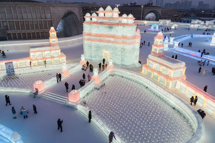 2023年2月1日,游客在哈爾濱冰雪大世界園區(qū)冰雪景觀《勝利之城》周邊游玩,該冰雪景觀以印度的法塔赫布爾西格里城為原型設(shè)計建造(無人機(jī)照片)。此屆哈爾濱冰雪大世界將上合組織成員國的特色建筑以冰雪景觀的形式呈現(xiàn)。新華社記者 謝劍飛 攝