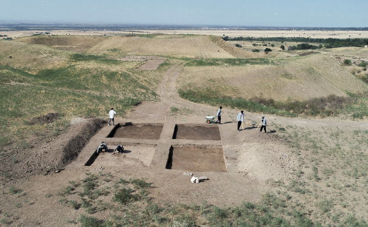 2023年8月9日,考古人員在中哈聯(lián)合考古項目拉哈特遺址探方上工作(無人機(jī)照片)。新華社發(fā)(奧斯帕諾夫攝)