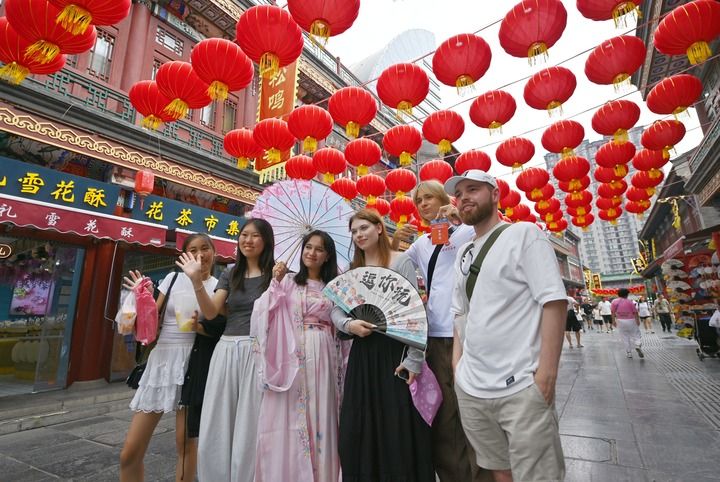 2025年8月14日,上合國家學(xué)生在天津古文化街留影。新華社記者 李然 攝