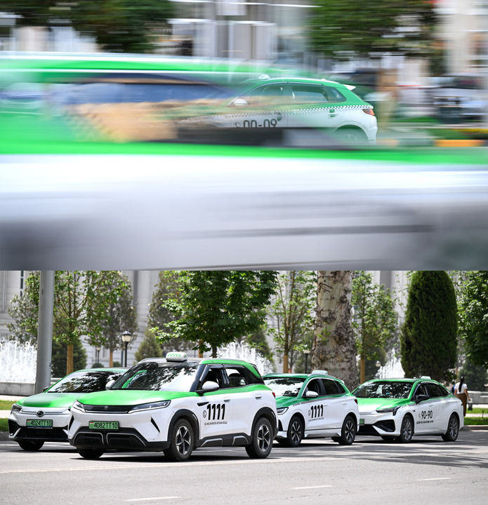 在塔吉克斯坦首都杜尚別,中國新能源汽車行駛在道路上(拼版照片,上圖攝于2025年5月28日,下圖攝于2025年5月29日)。新華社記者 李任滋 攝