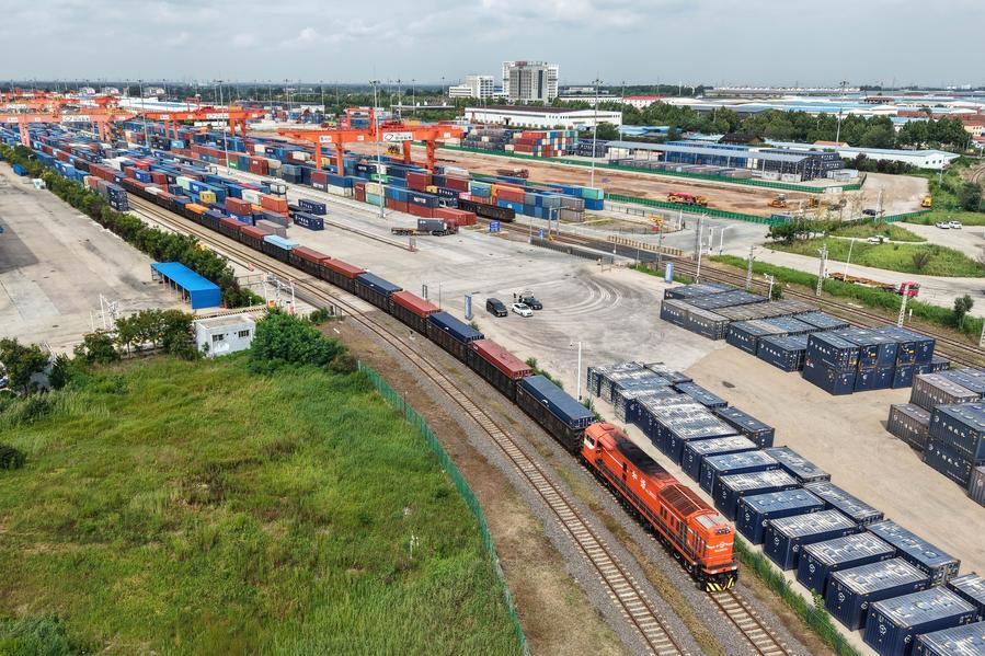 8月27日,一列貨運列車駛入位于上合示范區(qū)內的中國-上海合作組織地方經貿合作示范區(qū)多式聯(lián)運中心(無人機照片)。新華社記者李紫恒攝
