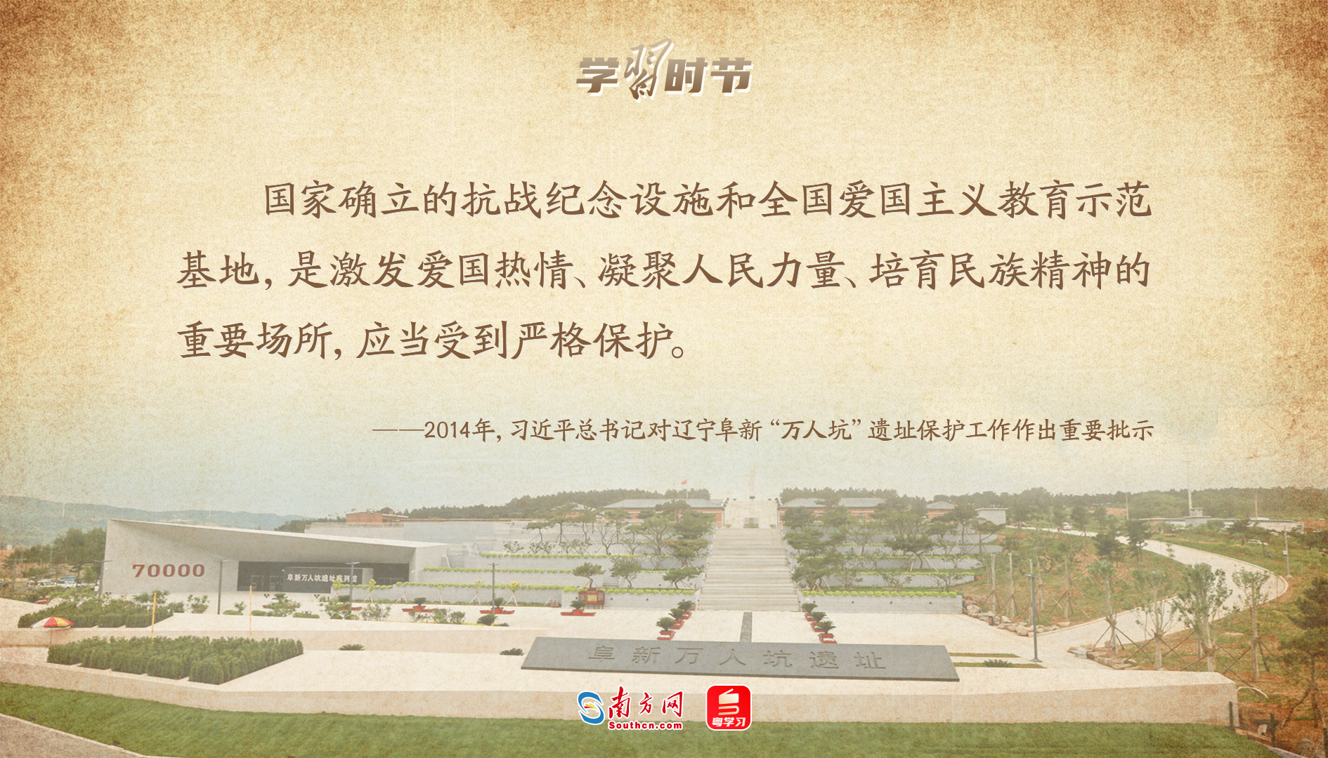 2014年9月,一份反映遼寧阜新“萬人坑”遺址遭破壞的報告送到了習(xí)近平總書記的案頭。習(xí)近平總書記對此寫下大段批示,要求遼寧省委、省政府和國家文物局要以高度的政治責(zé)任感,迅速落實對阜新“萬人坑”死難礦工紀念館的維修改善工作,盡早恢復(fù)其愛國主義教育基地功能?!坝蓄愃聘沸虑闆r的,務(wù)必抓緊進行維修,切實做好保護、利用工作,充分發(fā)揮其在加強愛國主義教育、培育社會主義核心價值觀中的重要作用。”