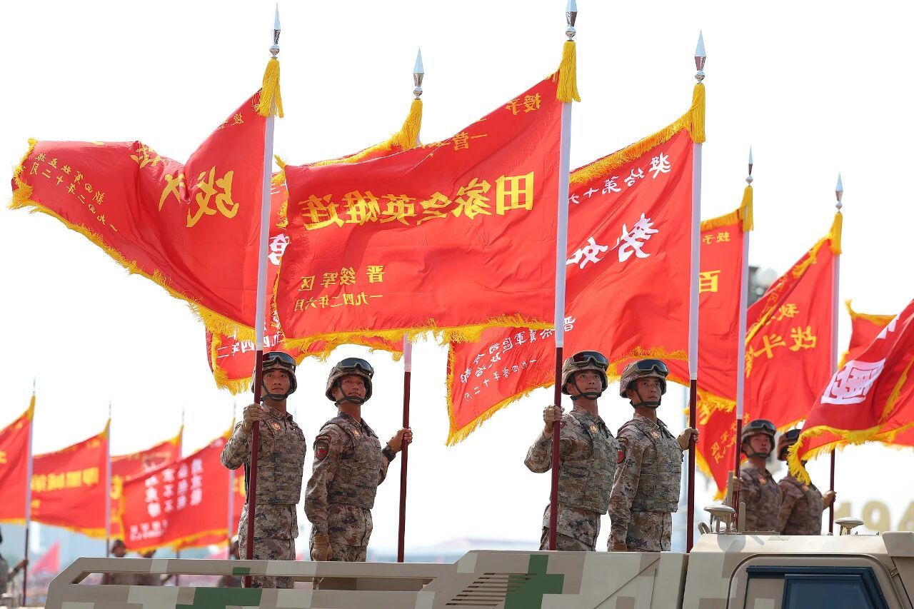 80面抗戰(zhàn)英模部隊榮譽旗幟組成戰(zhàn)旗方隊