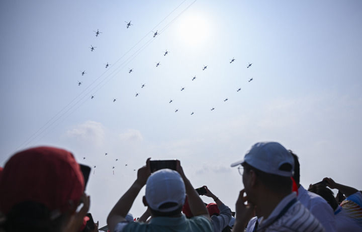 9月3日,習(xí)近平總書(shū)記同來(lái)自五大洲的外國(guó)友人并肩站立在天安門(mén)城樓上。26架直升機(jī)組成巨大的“80”字樣飛過(guò),眾人仰首凝望。