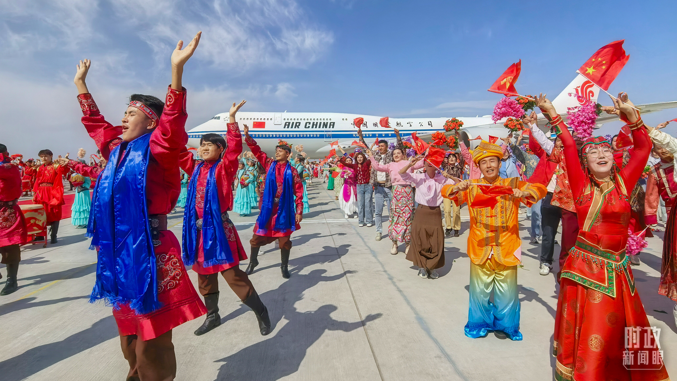 23日下午,烏魯木齊天山國際機(jī)場鼓樂喧天。總書記乘坐的專機(jī)在機(jī)場降落,等候在停機(jī)坪的新疆各族各界群眾熱烈歡呼。