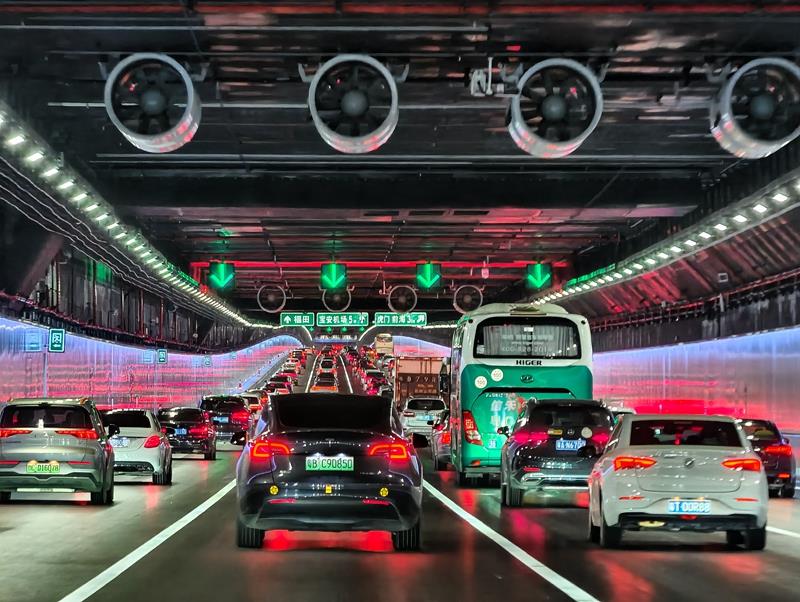 △2024年6月30日,深中通道正式通車,這是開通首日的深中通道海底沉管隧道內(nèi)的車流。
