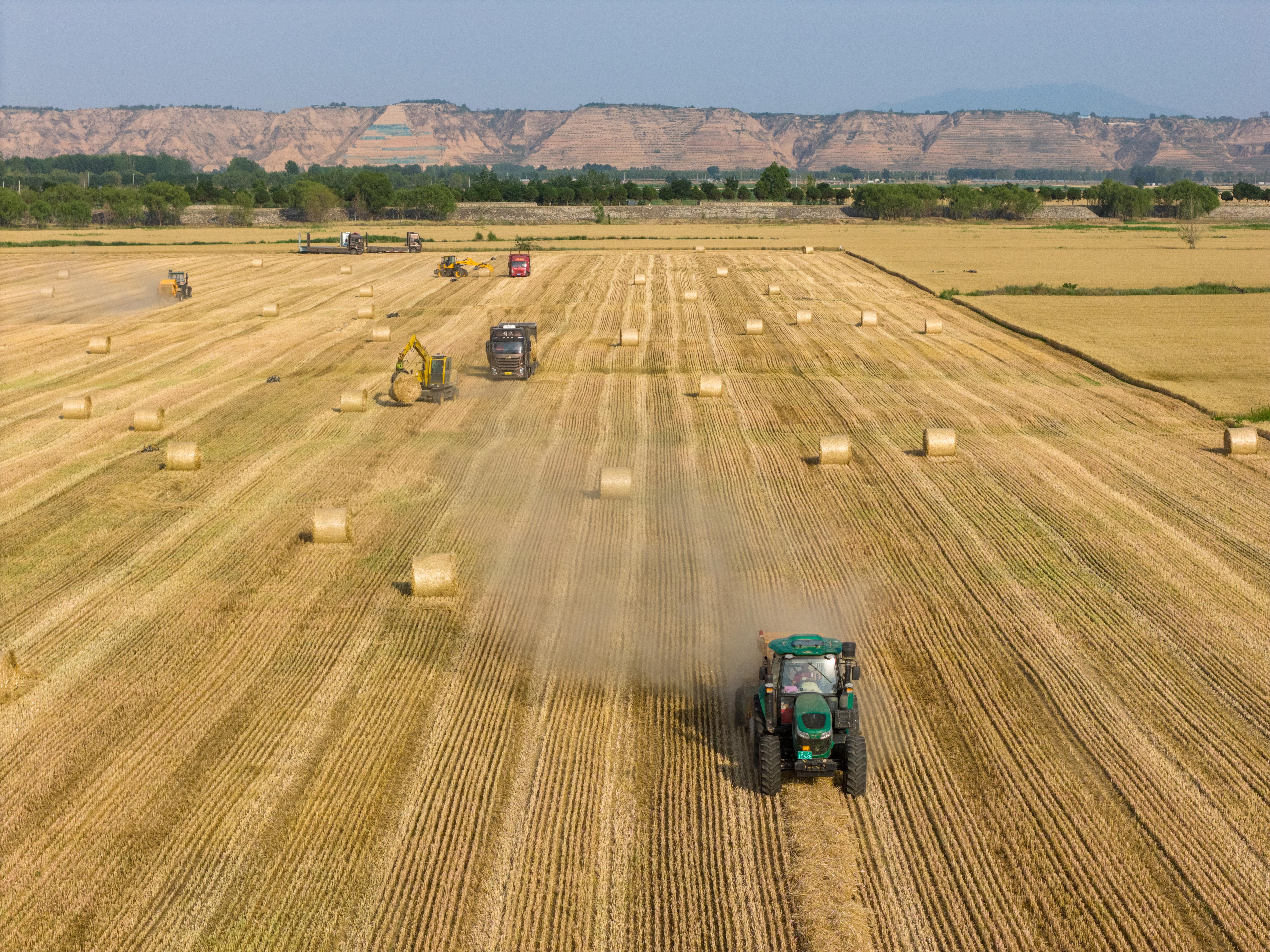 △據(jù)國家統(tǒng)計局發(fā)布的數(shù)據(jù),2025年全國夏糧總產(chǎn)量14973.8萬噸,實現(xiàn)穩(wěn)產(chǎn)豐收。圖為今年6月,山西運城裴莊鎮(zhèn)黃河灘涂上,農(nóng)機(jī)手忙著實施小麥秸稈打捆和裝車運輸作業(yè)。