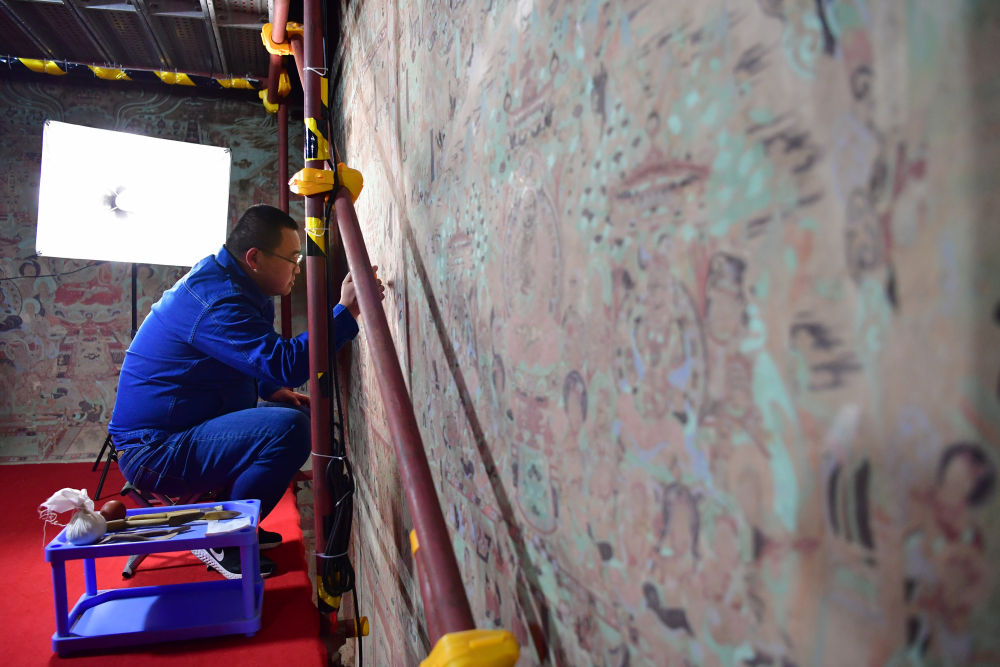 2022年4月19日,敦煌研究院文物保護技術(shù)服務(wù)中心的壁畫修復(fù)師楊金禮在莫高窟第231窟內(nèi)修復(fù)壁畫。