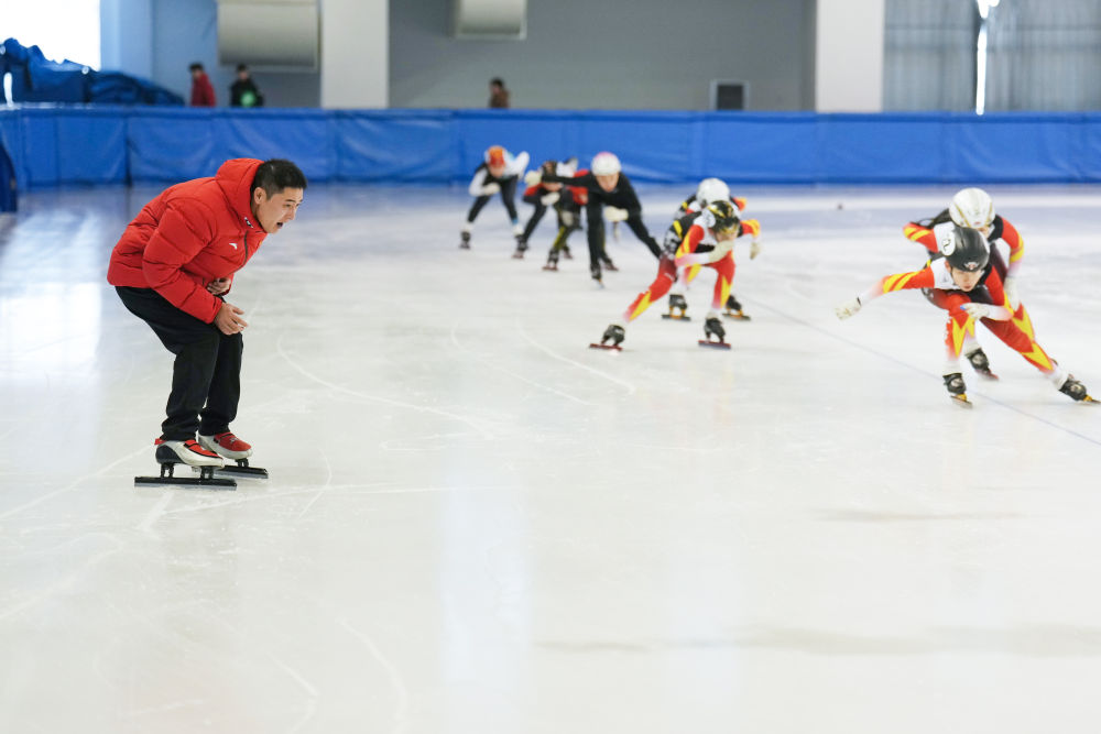 2025年1月24日,短道速滑教練姚忠華(左)在黑龍江省七臺河市短道速滑館指導(dǎo)運動員進行冰上訓練。十余年來,姚忠華累計執(zhí)教培養(yǎng)過200余名運動員。七臺河市擁有“奧運冠軍之城”的城市名片,在這里,教練員們一起筑夢冰場,為我國冰雪人才的儲備奉獻自己的力量。
