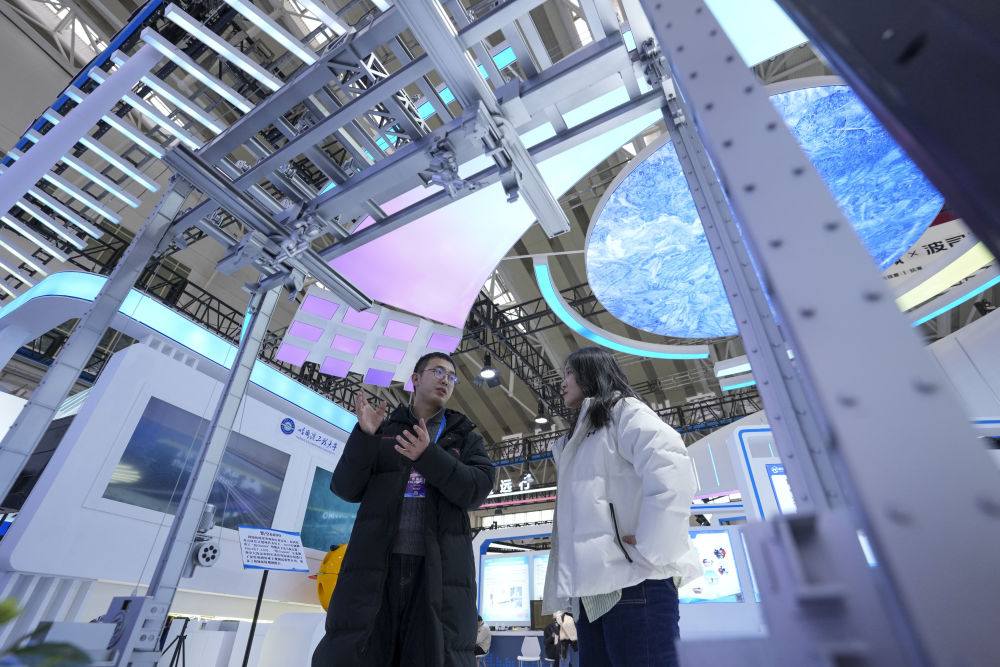 2026年1月6日,在2026哈爾濱國際冰雪經(jīng)濟博覽會展會現(xiàn)場,參觀者咨詢一款碳纖維滑雪板性能。