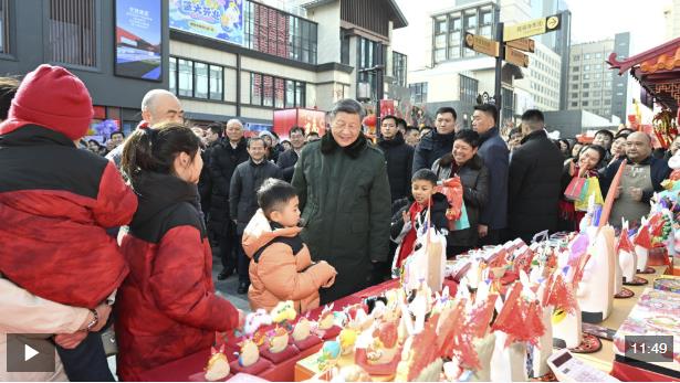 總書記察看街區(qū)風(fēng)貌和各式年貨攤位,同現(xiàn)場群眾親切交流。他愉快地向大家講起年少時(shí)多次到隆福寺的情景,還購買了特色食品和文創(chuàng)產(chǎn)品。