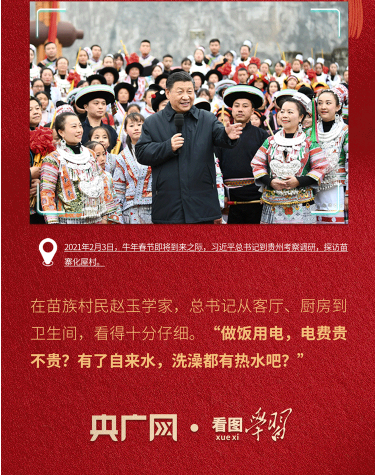 2020年底,貴州最后9個(gè)深度貧困縣退出貧困縣序列。次年2月,總書記就專程來(lái)到曾經(jīng)的深度貧困村——貴州省畢節(jié)市化屋村。在苗族村民趙玉學(xué)家里,總書記看得仔細(xì)、問(wèn)得真切,“做飯用電,電費(fèi)貴不貴?有了自來(lái)水,洗澡都有熱水吧?”一句句家常話,嘮的是具體事,暖的是百姓心。