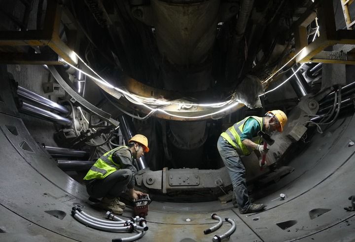 中鐵十八局集團(tuán)工人在石家莊市地鐵5號線一期工程01工區(qū)建設(shè)工地施工(2025年10月24日攝)。新華社記者 楊世堯 攝