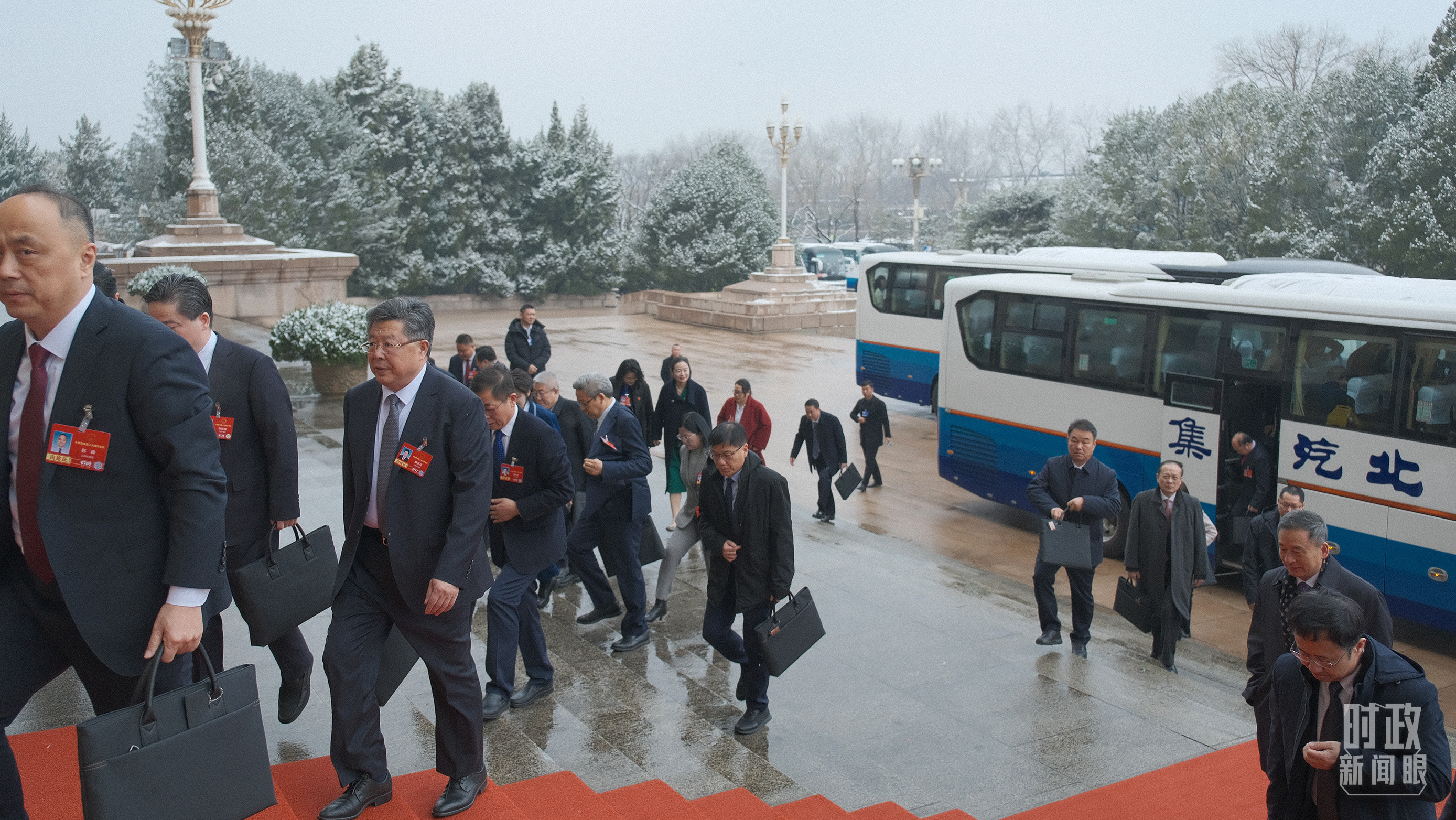 江蘇代表團(tuán)乘車前往人民大會(huì)堂。(總臺(tái)記者黃成拍攝)