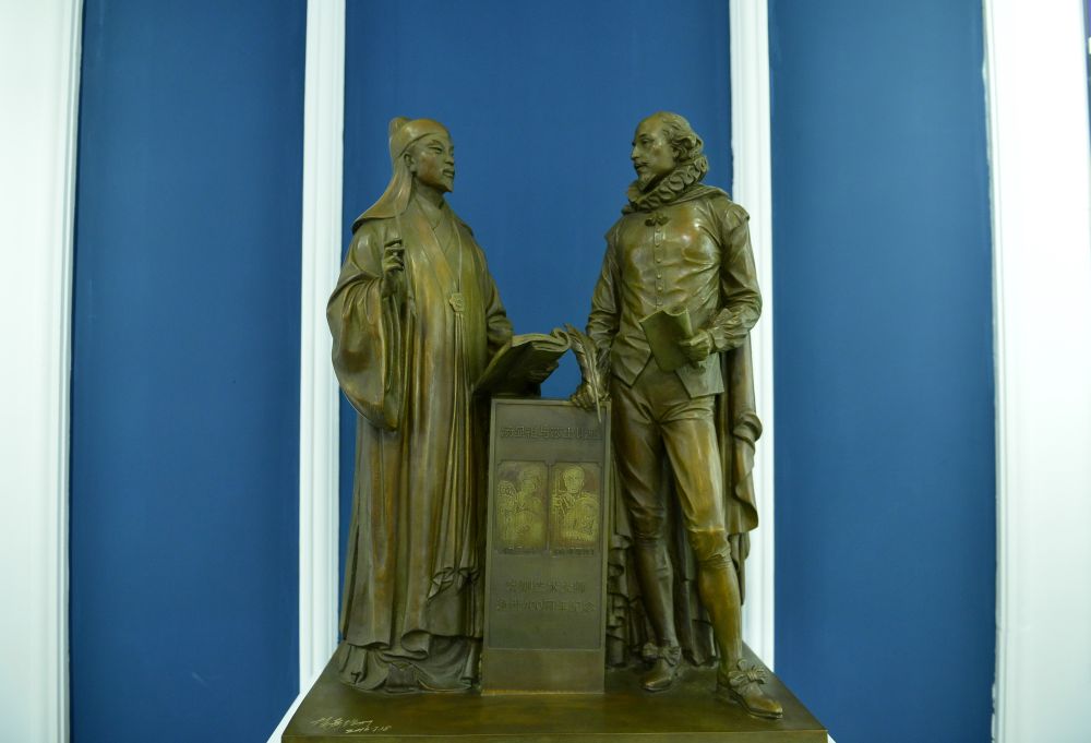 這是中國江西撫州湯顯祖紀念館陳列的湯顯祖遇見莎士比亞銅像(2016年10月12日攝)。新華社記者 周密 攝