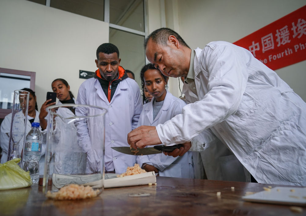 2025年8月20日,在埃塞俄比亞首都亞的斯亞貝巴,中方專家在亞的斯亞貝巴理工學院對大學生進行菌種制作技術(shù)指導。新華社記者 韓旭 攝