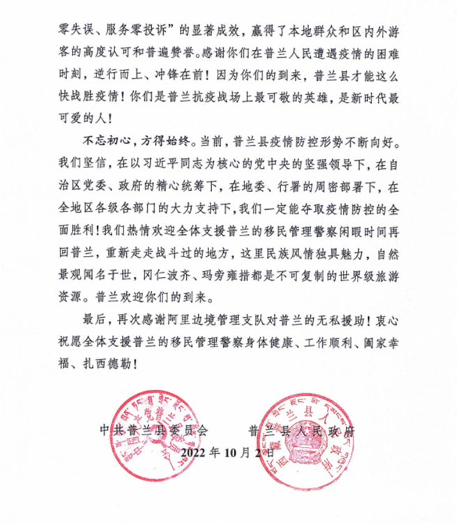 中國西藏網(wǎng)訊 “普蘭縣發(fā)生新冠肺炎疫情后,阿里邊境管理支隊第一時間選派精干力量支援普蘭疫情防控工作,為打贏疫情防控阻擊戰(zhàn)、攻堅戰(zhàn)發(fā)揮了至關重要的作用?!?0月2日,西藏自治區(qū)阿里邊境管理支隊收到一封來自阿里地區(qū)普蘭縣委的感謝信。信中對阿里邊境管理支隊戰(zhàn)“疫”一線民警在一個多月的疫情防控工作中,克服困難、勇于擔當、不分晝夜、持續(xù)奮戰(zhàn)的抗疫工作表達了感謝,給予了肯定。