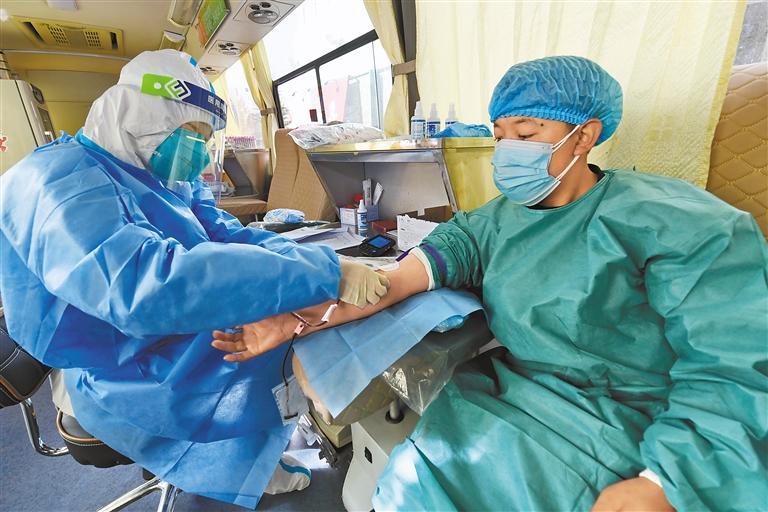 近日,西藏自治區(qū)無(wú)償獻(xiàn)血委員會(huì)向全區(qū)各級(jí)黨政機(jī)關(guān)、企事業(yè)單位、民間社會(huì)組織和社會(huì)各界愛(ài)心人士發(fā)出《致全區(qū)人民無(wú)償獻(xiàn)血倡議書》, 西藏各族各界干部群眾積極響應(yīng),踴躍參與無(wú)償獻(xiàn)血,奉獻(xiàn)愛(ài)心,傳遞正能量。 圖為醫(yī)護(hù)人員在采集血液。 記者 唐斌 攝