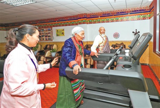 圖為在阿里地區(qū)噶爾縣老人集中供養(yǎng)中心,農(nóng)村特困老人在工作人員指導(dǎo)下進(jìn)行運動。記者 格桑吉美 攝