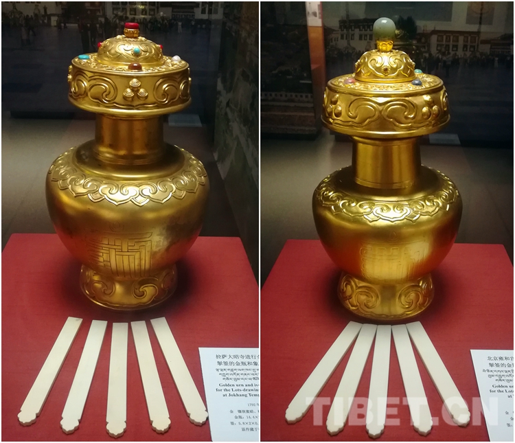 圖左為大昭寺進行金瓶掣簽的金瓶和象牙簽(復(fù)制品),圖右為雍和宮進行金瓶掣簽的金瓶和象牙簽(復(fù)制品)。攝影:李元梅