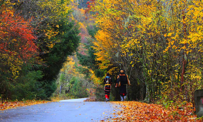 穿著民族服裝的情侶漫步在國道318之上,與秋日景色融成了一幅畫。