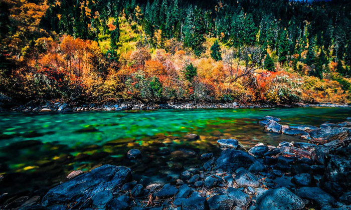 海拔較高的巴松措,秋日來的晚了一些,但秋日的痕跡已爬上樹梢。