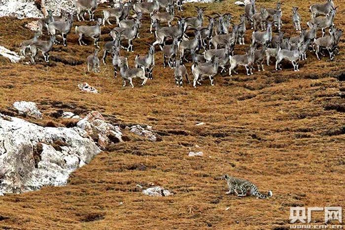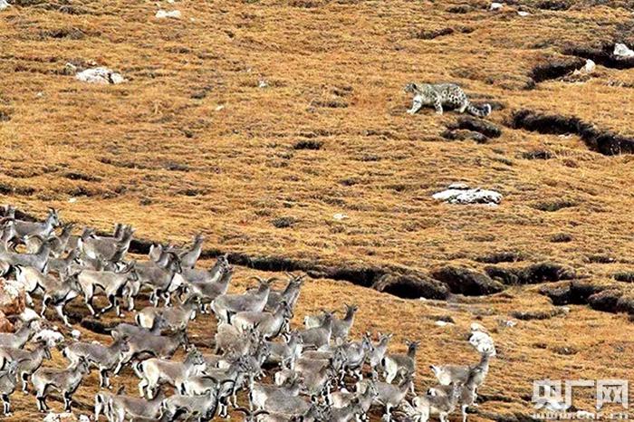 雪豹向巖羊群逼近。央廣網(wǎng)發(fā) 馮剛 攝