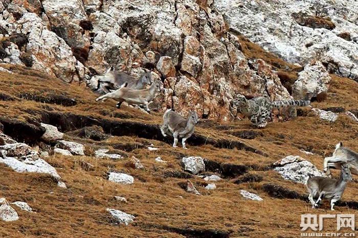雪豹向巖羊群發(fā)起攻擊。央廣網(wǎng)發(fā) 馮剛 攝